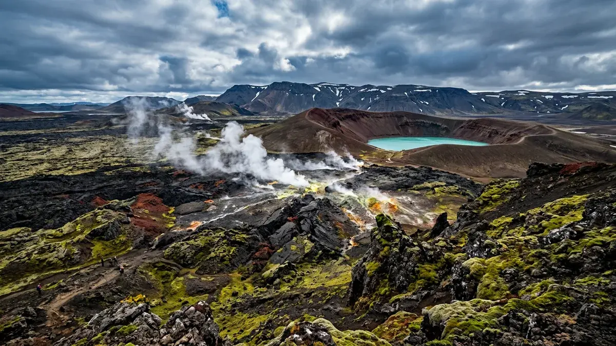 Krafla is an active volcanic system near Lake Myvatn with vast lava fields, steaming vents, and the Viti explosion crater. The Leirhnjukur lava field from the 1975-1984 Krafla Fires eruptions is still warm underfoot in places.