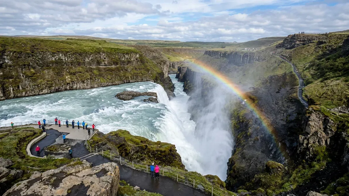 Gullfoss is one of Iceland's most iconic waterfalls — a massive two-tiered cascade where the Hvítá river plunges 32 metres into a narrow canyon. Part of the Golden Circle, it combines raw power with dramatic beauty and a compelling conservation story.