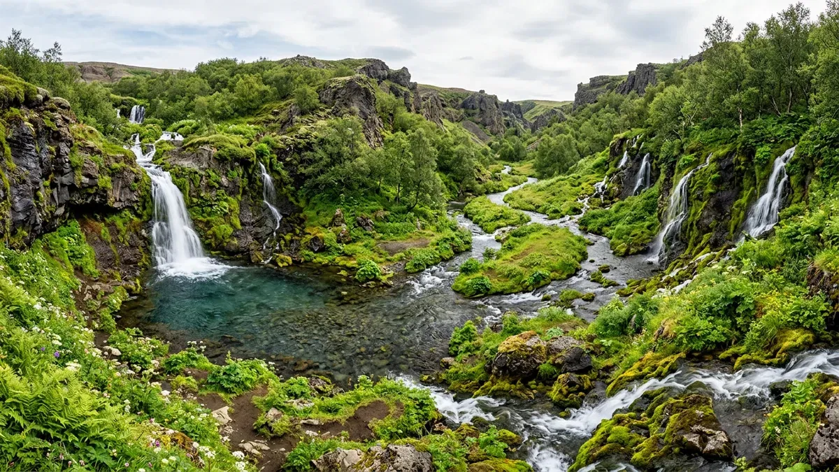 Gjáin is a hidden oasis in the Thjorsardalur valley — a sheltered ravine filled with small waterfalls, streams, and lush green vegetation. Often compared to a fairy-tale landscape, it remains one of South Iceland's best-kept secrets.