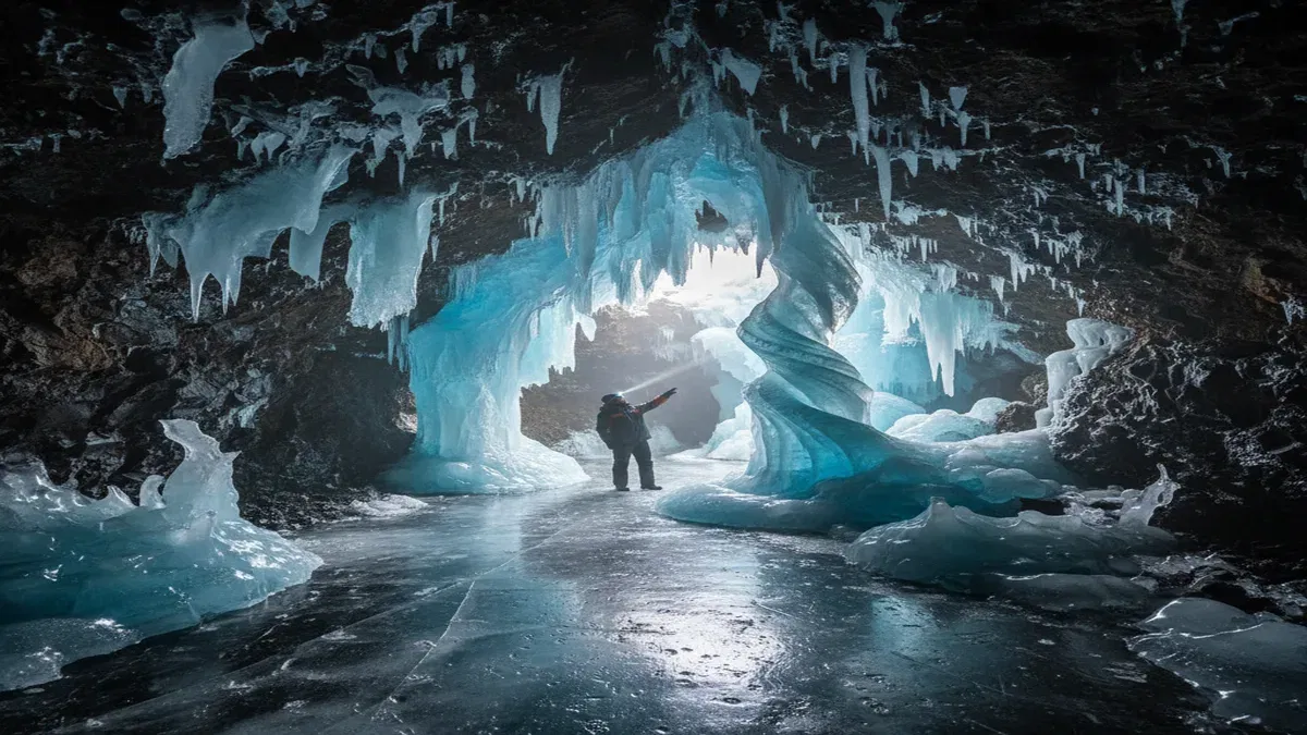 A 3,500-year-old lava tube east of Lake Myvatn containing spectacular natural ice sculptures that never melt, accessible only by guided tour with a hike across raw lava fields and a crawl through the cave entrance.