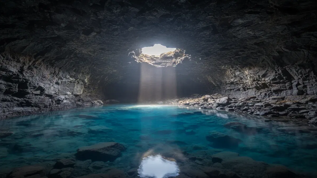 A small lava cave near Lake Myvatn with a geothermal hot spring inside, famous as a Game of Thrones filming location and for its turquoise blue water that is too hot for bathing.