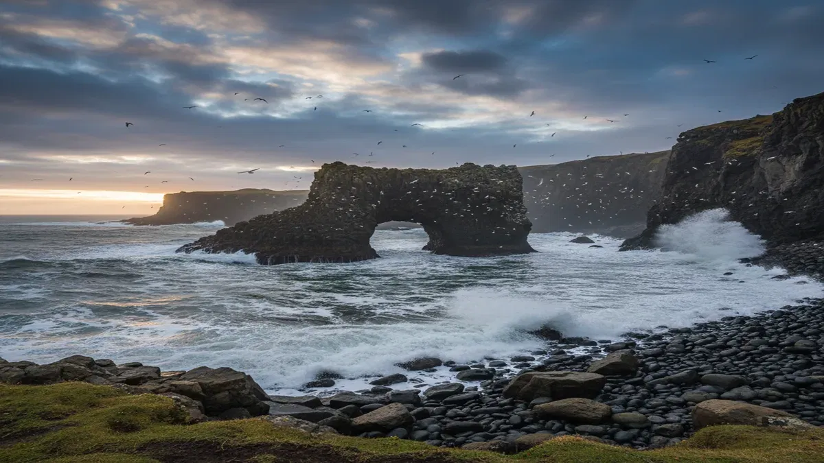 A natural stone arch carved from volcanic basalt by centuries of Atlantic wave erosion, located on the coastal path between Arnarstapi and Hellnar on the Snaefellsnes Peninsula.